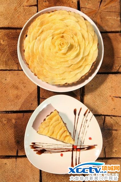 花红苹果派,苹果派做得像玫瑰,派皮加入红糖,苹果馅加肉桂、豆蔻炒香,一片片摆上苹果皮,再洒上肉桂粉,9吋售价850元,单片150元。李柏毅摄