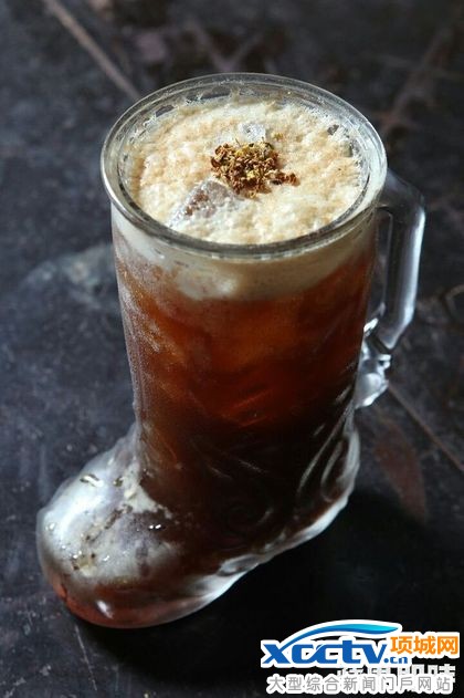台湾佬的假啤酒。Espresso大力shake后呈现泡沫,是咖啡,却像啤酒,再加上桂花,喝起来带有桂花的香气,店内招牌之一,售价140元。李柏毅摄