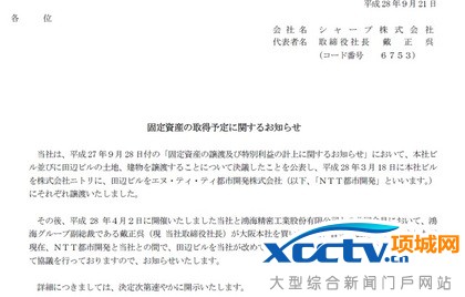 图为夏普今天公告,将从NTT手中买回原大阪总公司大楼中的田边大楼。取自夏普官网