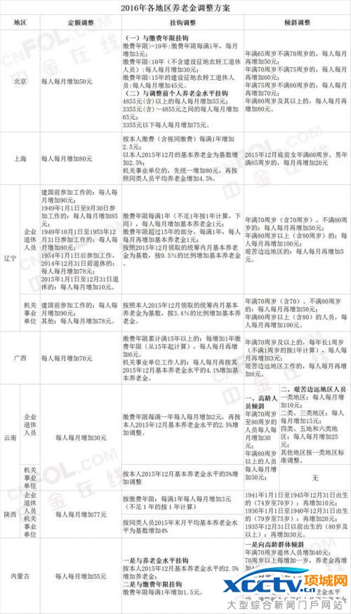 上述地区的调整方案还适当对高龄退休人员等群体倾斜予以了照顾。如,北京提出,年满65周岁不满70周岁的,每人每月再增加50元;年满70周岁不满75周岁的,每人每月再增加60元;年满75周岁不满80周岁的,每人每月再增加70元;年满80周岁及其以上的,每人每月再增加80元。点击阅读更多内容:14省市退休金大排行:没想到最高的是这里