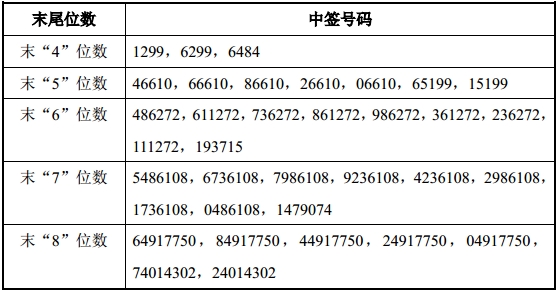 凡参与本次网上发行申购的投资者持有的申购配号尾数与上述号码相同的,则为中签号码。中签号码共有 48,024 个,每个中签号码只能认购 1,000 股亚翔集成 A 股股票。