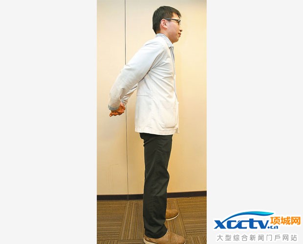 颈背肌力加强站立双手交叉于背后,收下巴挺胸,双手臂稍微往后抬高、肩膀往后拱起,维持5到10秒,重複做6到8次为1回,每天做3回,可加强肌力改善不良姿势。(记者陈易辰/摄影)