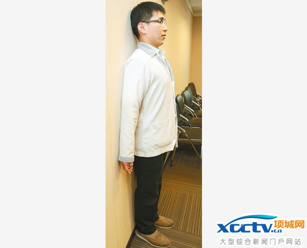 贴墙站立贴墙站立有助预防乌龟颈。放鬆站立将头、肩往后用力贴近墙壁,维持1至5分钟,每天至少做1次。(记者陈易辰/摄影)