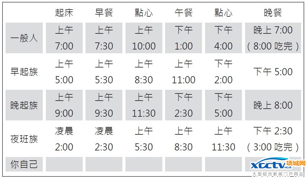 这表示你可能一天吃超过5 次!如果你很晚才上床,又或是超过3至4小时没吃东西,你必须额外加上一次当前这个阶段的点心。比方说,如果你晚上7 点吃完了晚餐,而你要到11 点或12 点才上床,你必须在吃完晚餐后3 至4 小时吃当天第3 次点心,而食物是属于当前这个阶段的。如果你担心怎样把这些吃喝行动塞进你繁忙的日程表里,放心好了,我的顾客都是跟你一样的大忙人,但他们都找得到时间每3 至4 小时吃1 次。关键是把吃喝排入你个人的日程表。不管你是早起的人或夜猫子,以下的表格给你几个範例,看看可以怎样做到。最后一行是让你填写自己的行程。