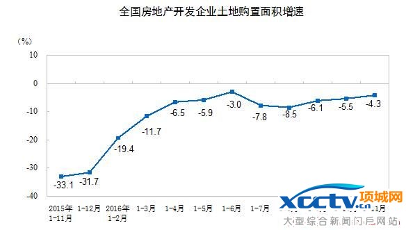 1-11月份,房地产开发企业土地购置面积19046万平方米,同比下降4.3%,降幅比1-10月份收窄1.2个百分点;土地成交价款7777亿元,增长21.4%,增速提高4.7个百分点。