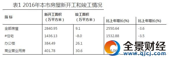 2016年,本市房屋新开工面积2840.95万平方米,增长9.1%。分类型看,住宅新开工面积有所下降,商办新开工面积较快增长。2016年,本市住宅新开工面积1436.13万平方米,比上年下降8.0%;办公楼和商业营业用房新开工面积384.49万平方米和401.78万平方米,分别增长26.1%和30.6%。