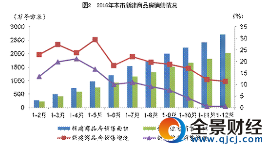 2016年,本市房地产市场成交总体较为活跃,全年新建商品房销售面积2705.69万平方米,比上年同期增长11.3%,增速比年内高点(1-5月)回落18.0个百分点。(见图2)。