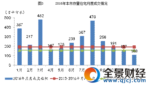 据市房地产交易中心统计,2016年,本市存量房成交量达到历史最高点。全年存量房网签面积3559.17万平方米,比上年增长6.5%。其中,存量住宅网签面积3160.66万平方米,增长4.2%。从月度成交情况看,存量住宅成交波动较大(见图3)。