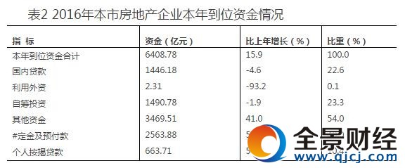 2016年,本市房地产开发企业本年到位资金6408.78亿元,比上年增长15.9%,项目资金到位情况良好(见表2)。