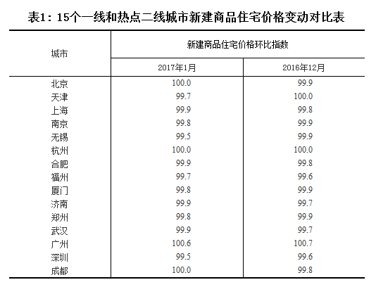 15个一线和热点二线城市因地制宜、因城施策实施房地产调控政策以来,市场变化明显,房价持续趋稳回落。其中,11个城市1月份新建商品住宅价格环比下降,降幅在0.1至0.5个百分点之间;3个城市环比持平;广州市环比上涨0.6%,涨幅已连续4个月回落。
