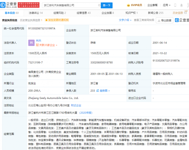 企查查信息显示,该公司成立于2001年,法定代表人为林杰,注册资本1500万元人民币,由浙江吉润汽车有限公司100%控股。