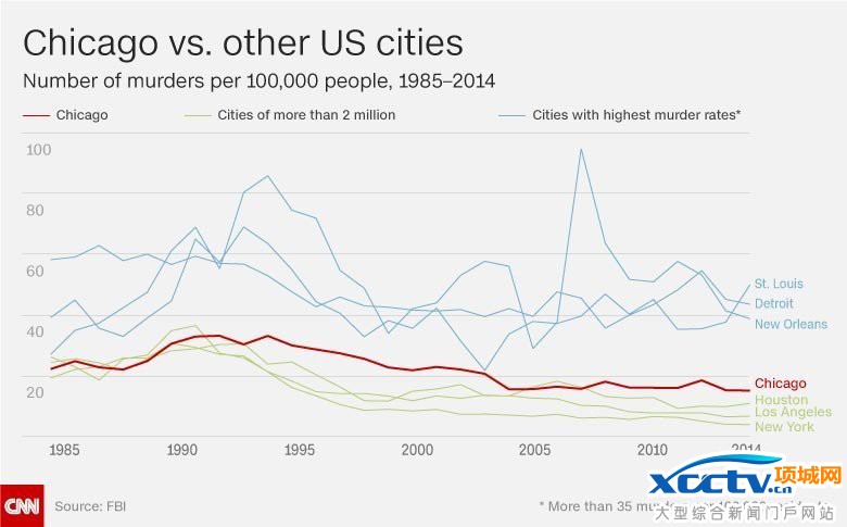 美国部分城市20年凶杀案数据:圣路易斯、底特律、新奥尔良均比芝加哥更为暴力