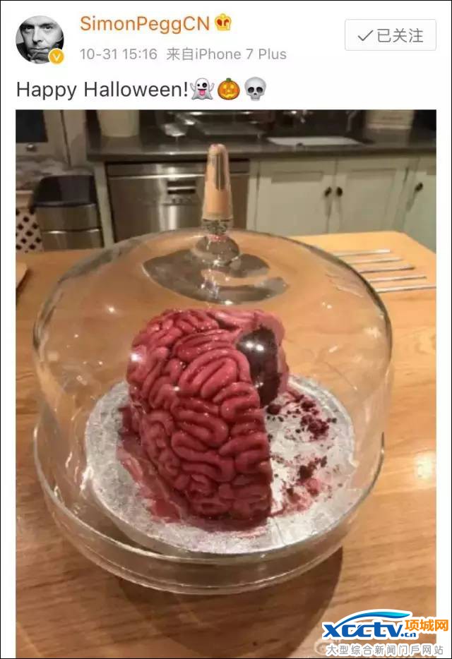 10月31日是西方的万圣节,下午三点多,《僵尸肖恩》主演西蒙·佩吉(粉丝也叫他“聚聚”或者“巨巨”)发了这么一张脑子蛋糕的图片,祝中国粉丝们万圣节快乐,然而这条微博下边粉丝评论的画风就……