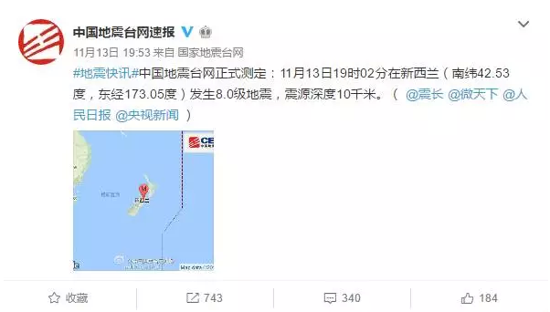 北京时间13日20:01分,地震发生后的一个小时,每经小编(微信号:nbdnews)注意到,演员李冰冰发了一条微博称:“飞奔下楼躲地震。”并且,她的定位是新西兰最大城市奥克兰,而奥克兰地处新西兰北岛中央偏北地带,与震中距离还比较远。可见,这次地震的波及范围比较广。