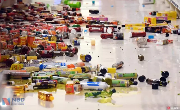 地震发生后,当地网友纷纷在社交媒体上晒出了受灾情况。比较典型的情况是,超市一片狼藉。