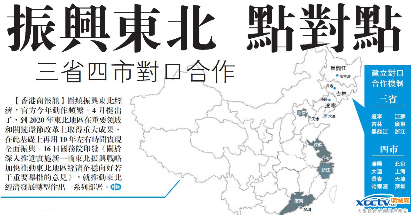 《意见》提出将组织辽宁、吉林、黑龙江与江苏、广东、浙江3省,还有渖阳、大连、长春、哈尔滨和北京、上海、天津、深圳4市建立对口合作机制。