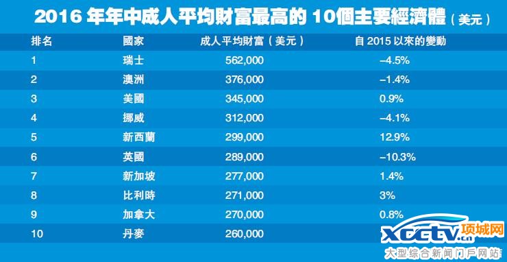 2016年成人平均财富表 瑞士成全球最富裕国家