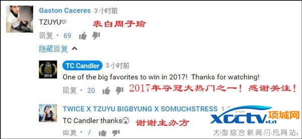 而在Youtube官方视频下,TC Candler回复网友说,周子瑜已经成为2017年的夺冠热门。