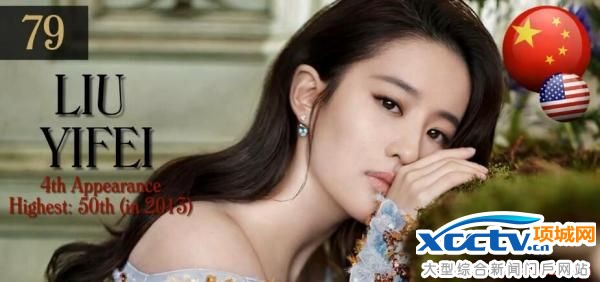 比如刘亦菲,排名79,第四次入选,最高曾于2013年排到第50名。她虽然生于中国,事业也活跃在中国,但因为拿的是美国国籍,所以右边给了一大一小两个圈;