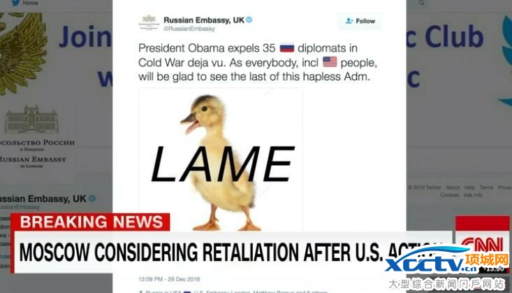 近日,美国总统奥巴马宣布对俄制裁的新闻引起网友热议,好好的奥巴马为什么跟俄国过不去?制裁俄国的理由是什么?美国总统奥巴马29日宣布,因俄罗斯涉嫌通过网络袭击干预美国总统选举而对俄进行制裁。俄罗斯驻英使馆在社交媒体“推特”回应称,这是冷战的既视感。该推特配图跛脚鸭以讽刺奥巴马。