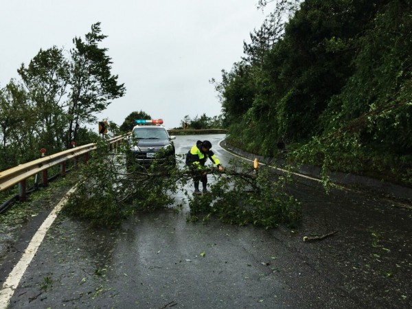 仁爱警分局翠峰派出所员警,在台14甲线22公里路段附近发现被风段落的树枝。(记者陈凤丽翻摄)