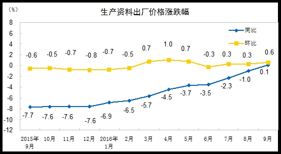 2016年9月份,全国工业生产者出厂价格环比上涨0.5%,同比上涨0.1%,同比是自2012年3月份以来首次由负转正。工业生产者购进价格环比上涨0.4%,同比下降0.6%。1-9月平均,工业生产者出厂价格同比下降2.9%,工业生产者购进价格同比下降3.8%。