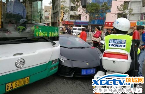10月27日9时许,在昆明市西坝路与永乐路交叉口,发生一起公交车与兰博基尼跑车相撞的交通事故,引得路过的市民驻足围观。据悉,交警赶到后,发现兰博基尼未张贴检审标志和保险标志,也未查询到保险记录,对兰博基尼作出扣车处理,判定全责属于兰博基尼。