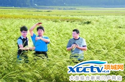 海水稻比普通水稻高很多。图为几名成年男子和海水稻“比身高”。