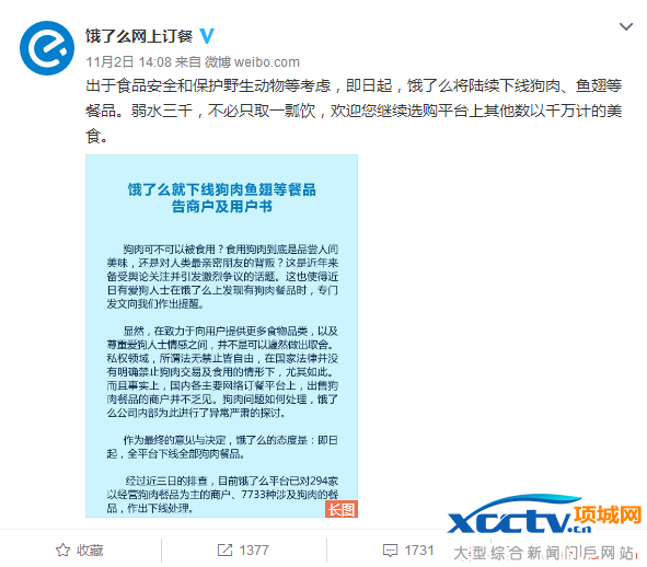 11月2日,饿了么通过官方微博发布通告称,出于食品安全和保护野生动物等考虑,即日起,饿了么将陆续下线狗肉、鱼翅等餐品。这是国内主要订餐平台首次公开停售狗肉。