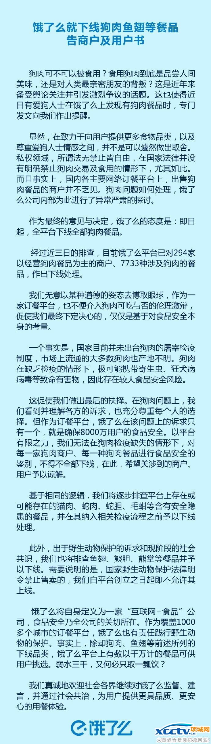 “以平台有限之力,我们无法在狗肉检疫缺失的情形下,对每一家狗肉商户、每一种狗肉餐品进行食品安全的鉴别,不得不全部下线,在此,希望关涉到的商户、用户予以谅解”,饿了么这样表示。