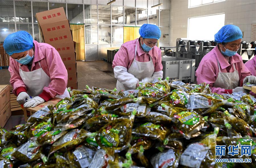 2月20日,工人在远航实业有限公司生产线上忙碌。 当日,位于河南省平顶山市郏县冢头镇前王庄村的远航实业有限公司,在做好疫情防控的同时,有序组织工人复工复产。远航实业有限公司是一家生产出口腌渍蔬菜的农副产品加工企业,带动当地村民和贫困户就近就业。 新华社发(郝源 摄)