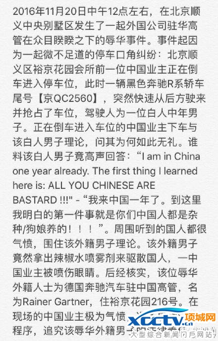 事件因为一起微不足道的停车口角纠纷:北京顺义区一位中国业主在倒车进入停车位,此时一辆黑色奔驰R系轿车尾号【京QC2560】,突然快速从后方驶来并抢占了车位,驾驶人为一位白人中年男子。