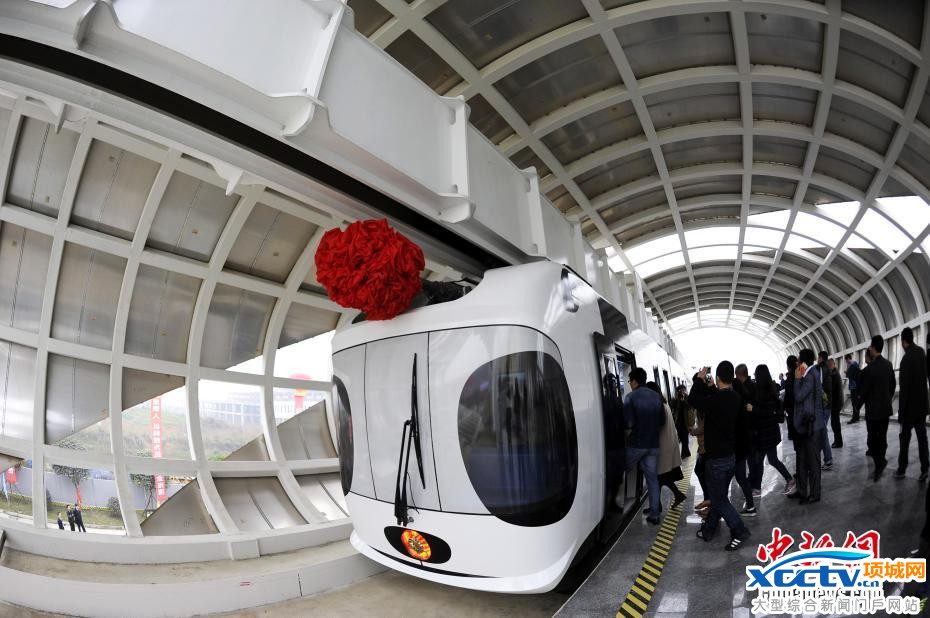 新能源空铁试验线正式运行后,列车进行了试跑。记者在现场看到,这列新能源空中悬挂式轨道列车由两节车厢组成,外表为大熊猫样式,整体悬挂在一根箱形轨道梁上。车厢内饰蓝白相间,和常见的地铁、轻轨等公共轨道交通列车相似。新能源空铁以60公里的时速一路“飞行”,打开了改善城市拥堵的想象空间。