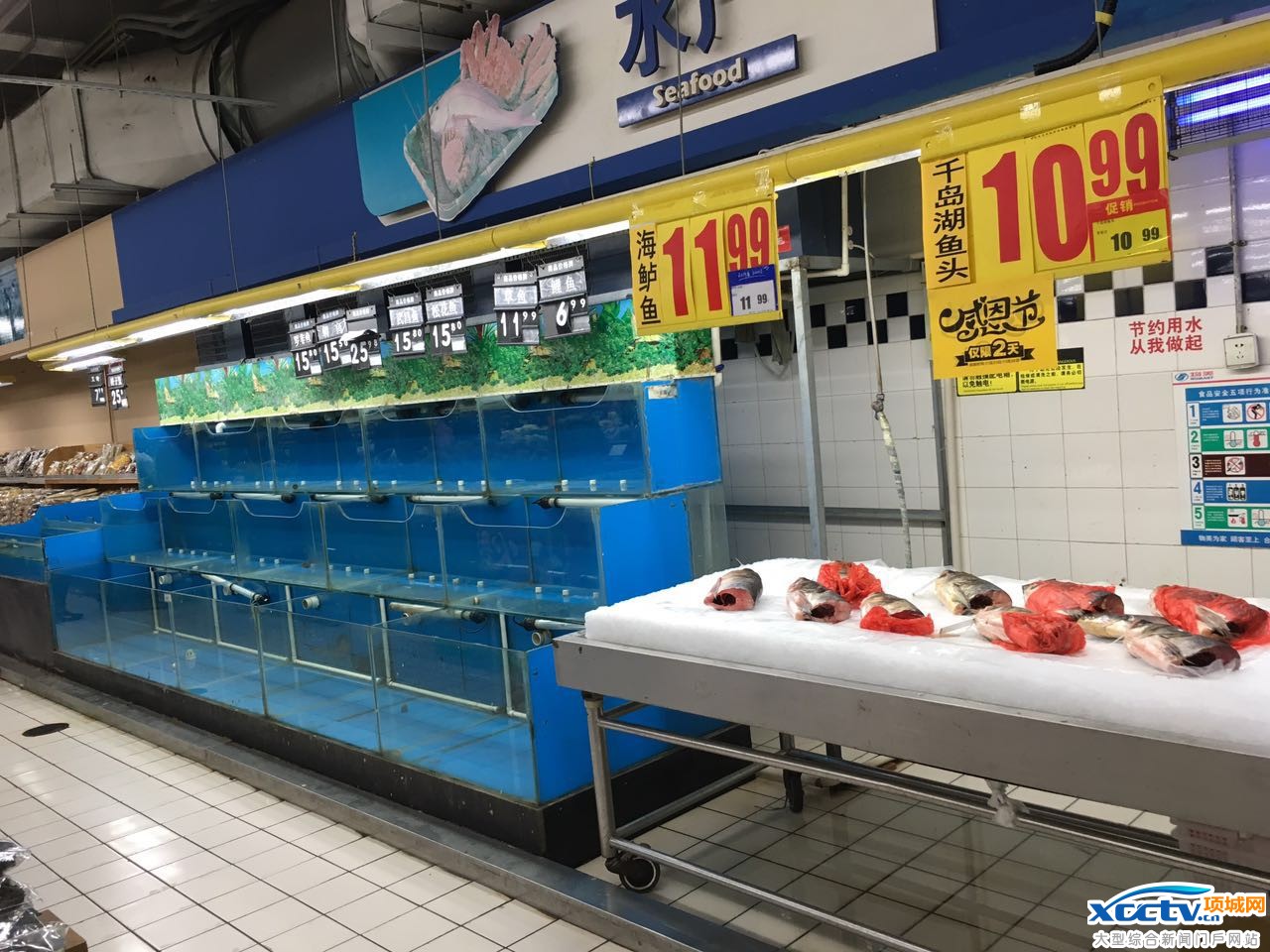 位于北京市通朝大街的物美超市里面,水产区的水箱里空空如也。