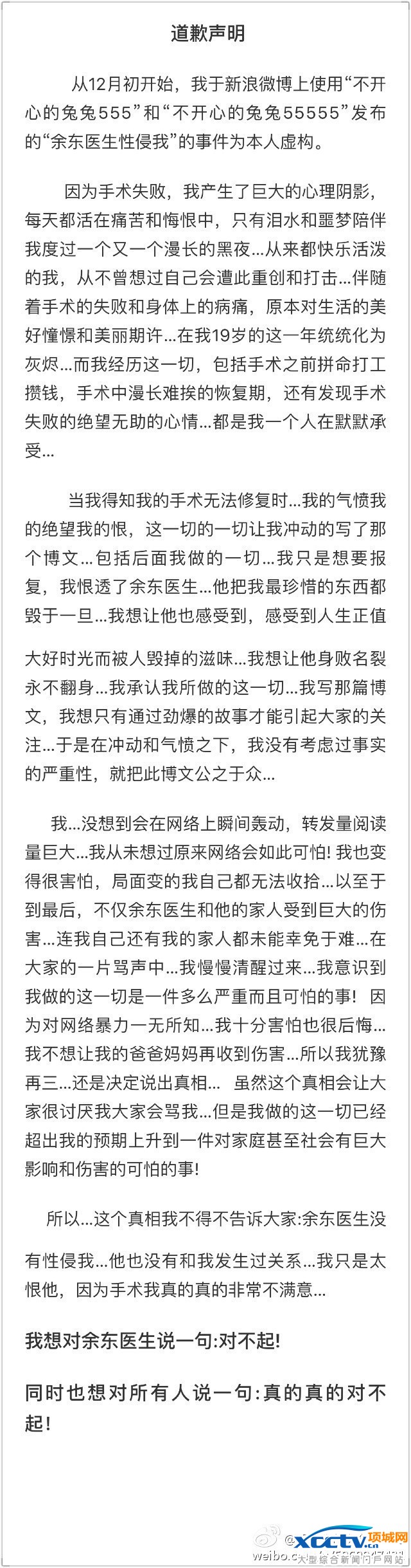 今天下午,疑似上海九院性侵门事件的当事人@不开心的兔兔55555发表道歉声明,承认“医生利用手术性侵”系虚构,因对手术结果太不满意而心生怨恨。