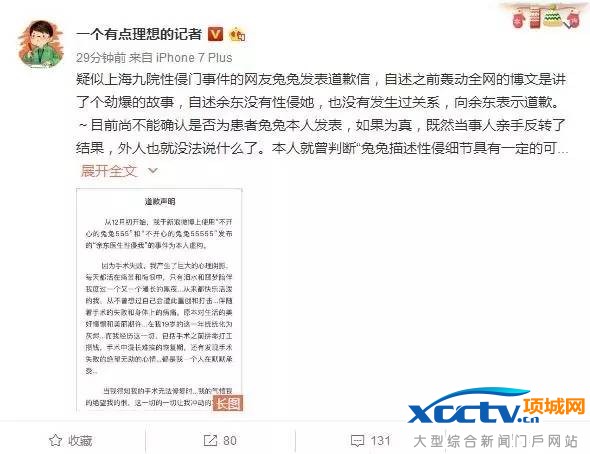 综投网讯 社会发展进步飞速,消息的传递也是,但是在曝光一些黑暗事情的时候,也会有人利用舆论来造势。昨天下午,疑似上海九院性侵门事件的当事人@不开心的兔兔55555发表道歉声明,承认“医生利用手术性侵”系虚构,因对手术结果太不满意而心生怨恨。
