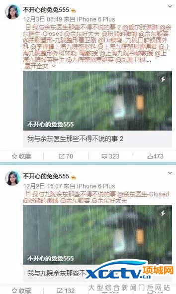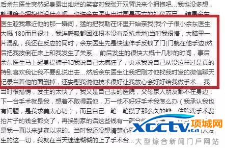 近日,网友@不开心的兔兔555在微博发表多篇长文,通过图文形式,非常详细地介绍了事情经过。其自称是一位19岁的女孩,因为对自己脸型不满意,一直在攒钱手术,并通过网络查找到上海九院余东医生。但在其就医住院过程中被性侵三次,且“脸部毁容”。