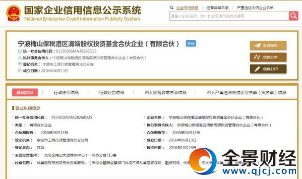 工商资料显示,清晗基金的全称是宁波梅山保税港区清晗股权投资基金合伙企业(有限合伙),于2016年6月13日成立,2016年10月24日获得核准,经营范围为私募股权投资及相关资讯服务。