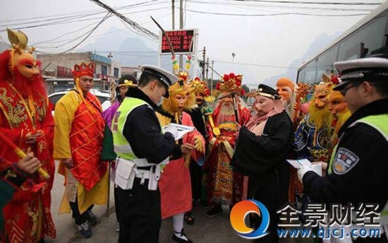 据了解,他们都是来自济源五龙口庙会的演员,正要下乡去演西游记,没想到刚出门上路就被交警拿住,经过认真询问和登记后,交警将他们放行。