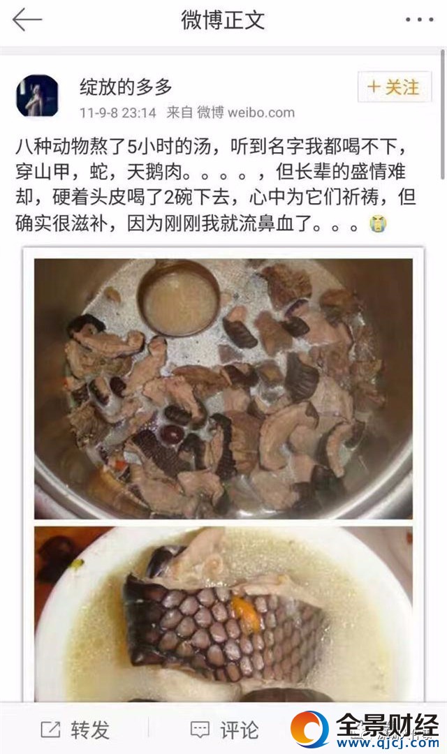 穿山甲、天鹅、蛇,这些原料从哪里来的?而且补的流出血来?据了解,穿山甲药用价值里具有活血调经的作用,用于治疗妇女月经减少,闭经,痛经,经血黑等,突然懂了为何一大堆女人在吃穿山甲,同时也感谢廖总每天夜里的四个小时的款待,突然觉得信息量很大很大。