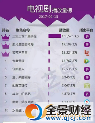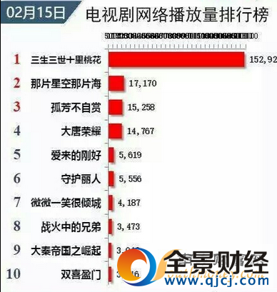 2月15日电视剧网络播放量排行榜:1三生三世十里桃花2那片星空那片海3孤芳不自赏