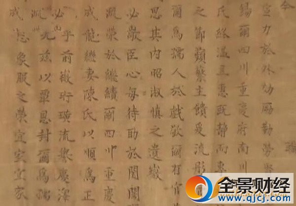 这幅圣旨材料为提花锦缎,整体底衬是纵横交错的云彩图,总长1.2米,宽0.31米,用汉文和满文两种文字书写,圣旨正文汉字部分用楷书书写,共计19行,325个汉字,满文部分共计23行。 全景财经网微信号:石化宝