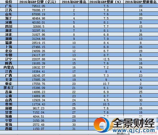 31省市区GDP排名出炉 2016年全国GDP增速排名布 全国31省市区GDP