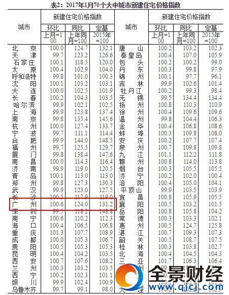 国家统计局今日发布了2017年1月70个大中城市住宅销售价格统计数据,从数据显示,广州新建住宅房价环比上涨0.6%,同比上涨24%。一月份,广州是15个一线和热点二线城市中,唯一房价保持上涨的城市,其中北京与12月持平,上海微跌0.1%,深圳跌0.5%。至此,广州已连续22个月保持房价上涨。