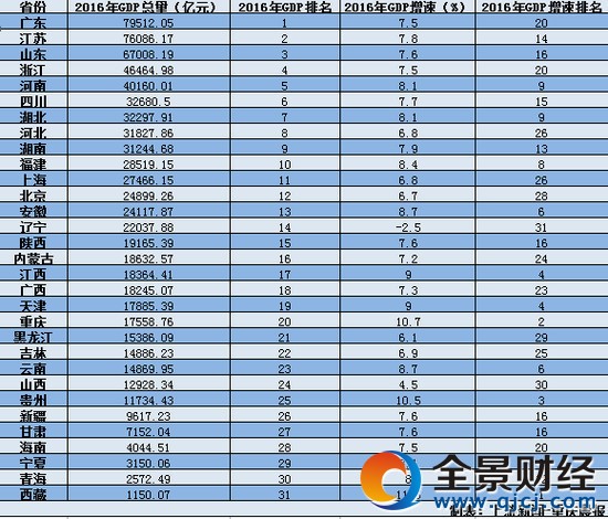 2017年中国31省市区GDP公布 2016年各地GDP数据排名出炉