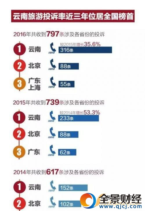 然而,游客数量和旅游收入增长的背后,投诉也逐年攀升。据人民网旅游3·15投诉平台统计数据显示,从2014年开始,云南旅游投诉率已连续三年“霸占”全国榜首。