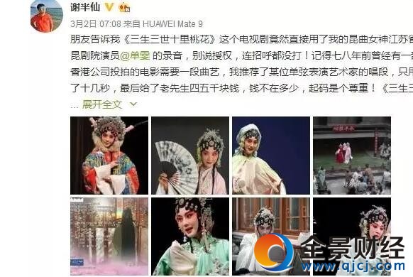 昨天,一条指责热播剧《三生三世十里桃花》侵权的微博引发热议。名为“谢半仙”的微博用户发微博称,《三生三世十里桃花》在未经授权、甚至连招呼都没打一声的前提下,在剧中擅自用了江苏着名昆曲演员单雯的录音音频。剧组回应表示:对此事十分重视,已于2日进行处理并主动联系到了演唱者单雯本人,并真诚道歉和积极沟通版权事宜,希望能弥补给版权方带来的损失。