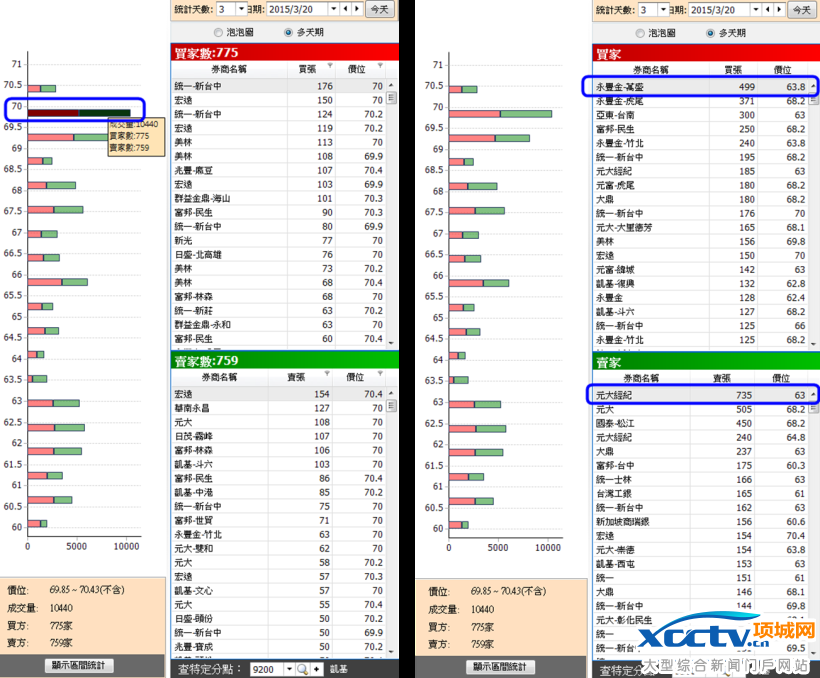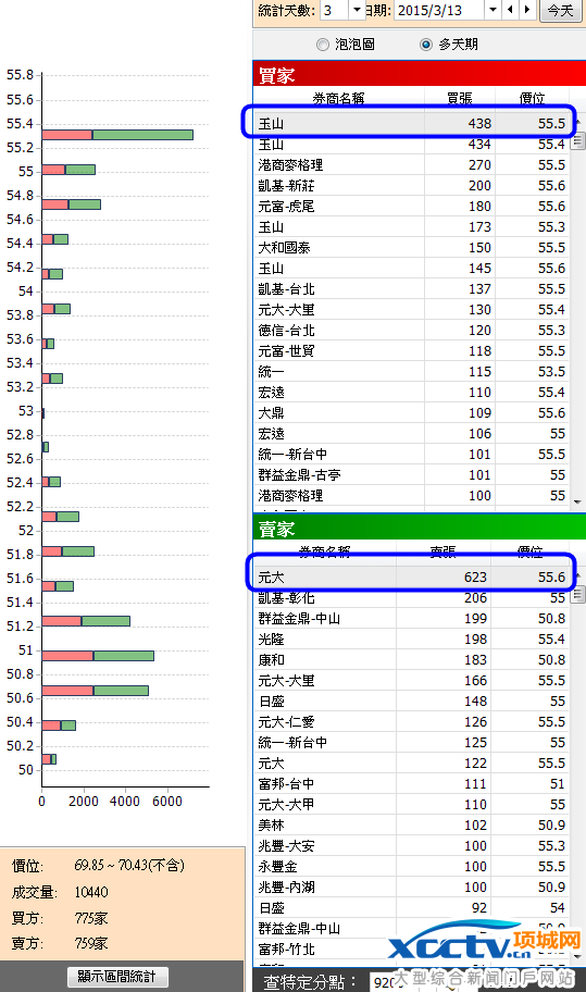 可以发现 2015/3/13(五) 最大买家为玉山,在55.5元大买了438张