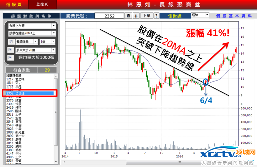 1. 选择股价站在週 20MA 之上:以週线来选长线股价稳定的股票
