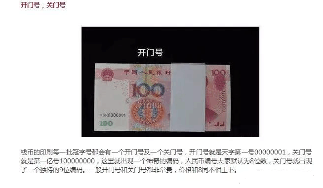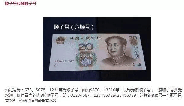 纸币编号同我们的出生日期,如:20010205、19861123等,这样的号码为19和200、201等开头,常常用于生日礼物等馈赠礼品,一般可遇不可求,也是纸币收藏的乐趣之一吧。综上,人民币中的同号、开门号、顺子号等都具有很高的收藏价值的,我们碰到了就得好好保存。